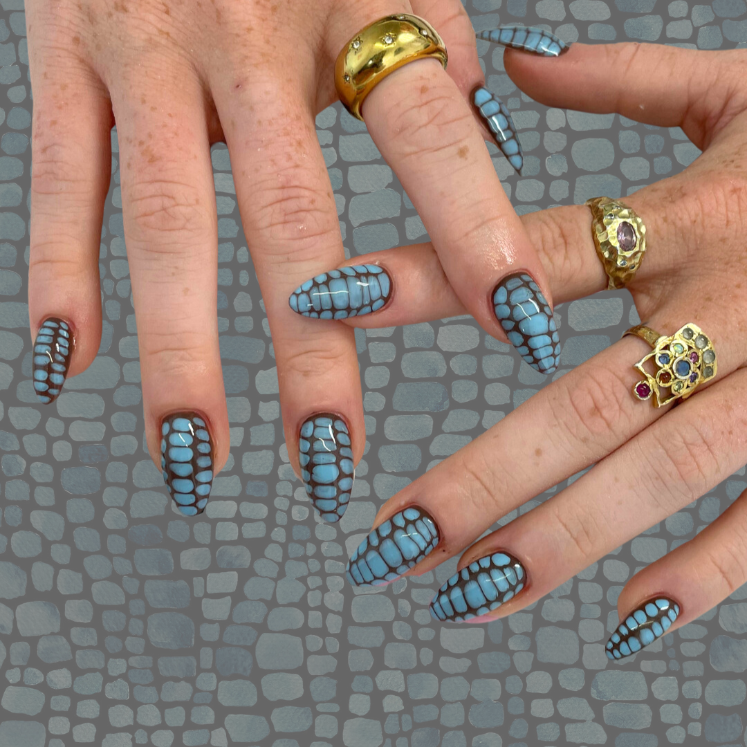 Lav disse fede croco negle blot med 2 lækre Polish og Blooming gel! Læg et lag af 262 som bundfarve og hærd 30-60 sek. Læg et lag af Blooming gel og lav prikker af 166 inden du hærder laget.