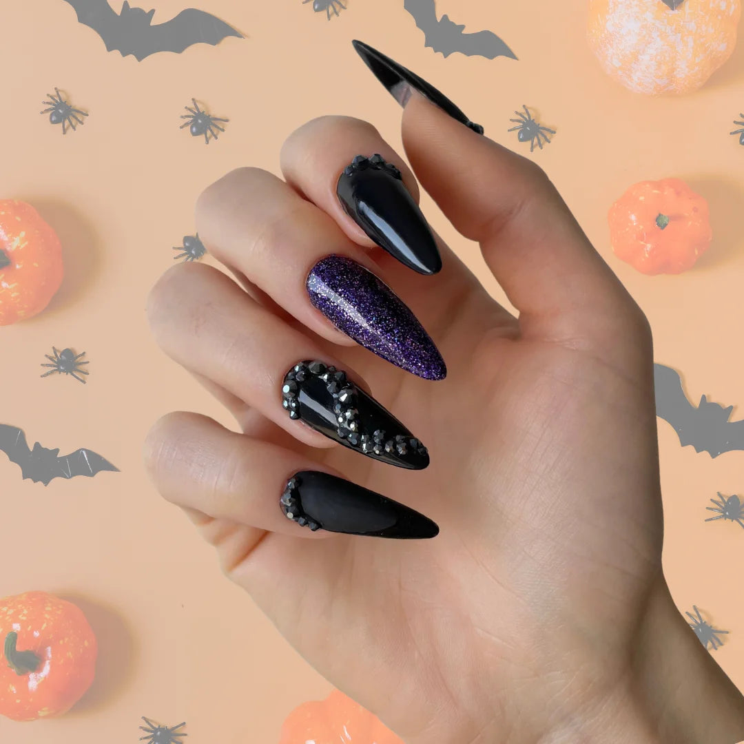 Clara har lagt Hybrid Soak Off Polish SC-16 oven på 082 og lagt Matte/Velvet Topcoat på den sorte farve, derefter har hun malet en fransk kant med No Wipe Shiny Topcoat. Til sidst har hun pyntet med sorte Rhinsten.