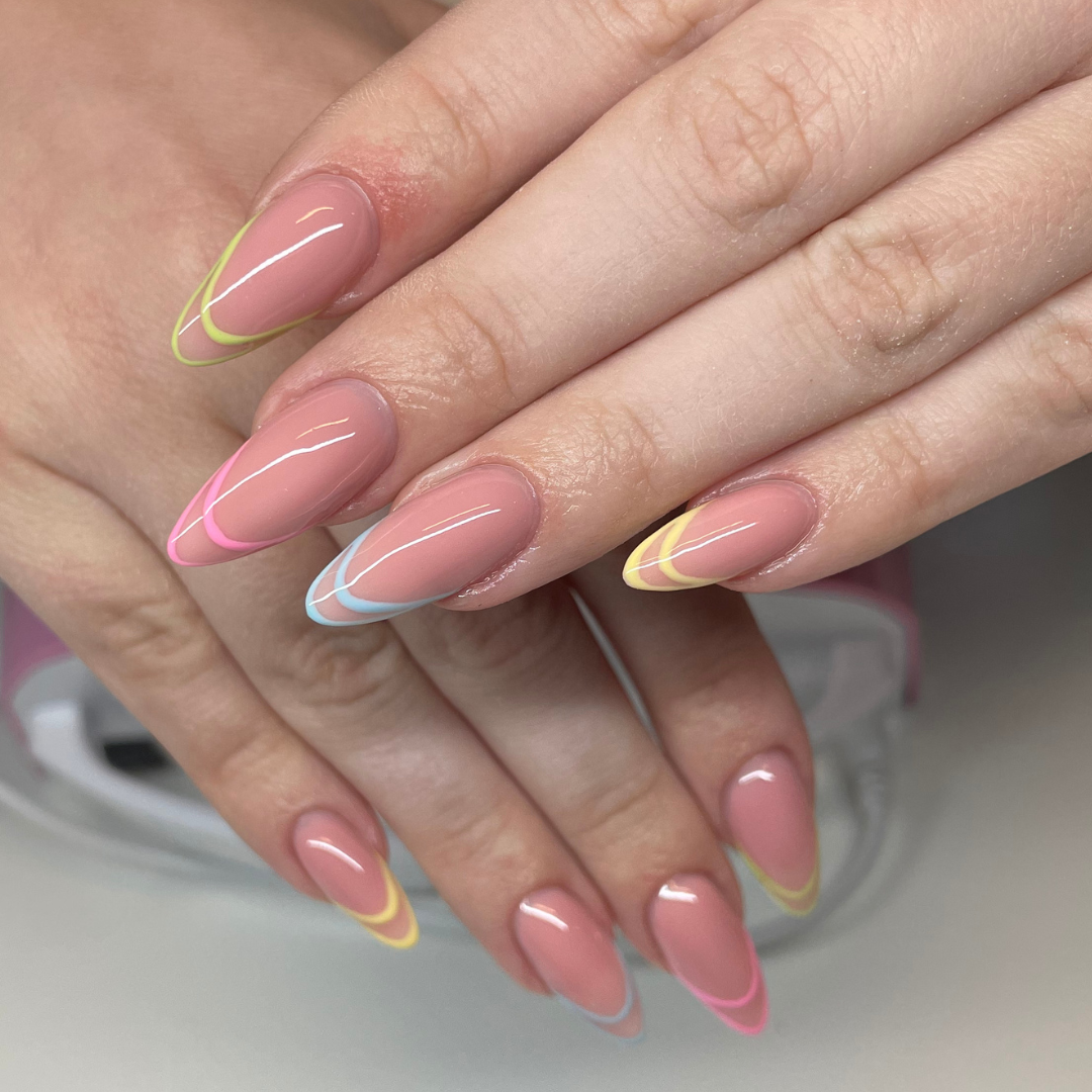 Ella har lavet disse flotte franske negle, på en baggrund af Less Filing Gel i farven Pretty Please og har malet dem med hendes yndlings pastel farver