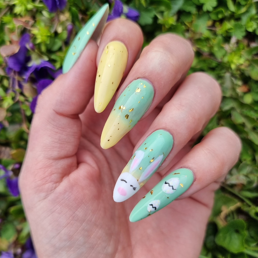 Start med at læg base farverne og lad lange fingeren og ringe fingeren forblive uden, når du så har lagt de lag du ønsker så gør du dig klar med Ombre penslen og lægger 014 og 013 som du ser på billedet og inden du hærder stryger du Ombre penslen frem og tilbage så du får den ønskede fade. Gentag med lag indtil du er tilfreds. Herefter lægger du Gold Leaf Top på alle neglene og hærder. Nu er du klar til at lave designet, brug først 030 med din Liner pensel, derefter 025 og til sidst 082 til de sidste detaljer. Afslut med No Wipe Shiny Topcoat og så er du altså klar til påske!