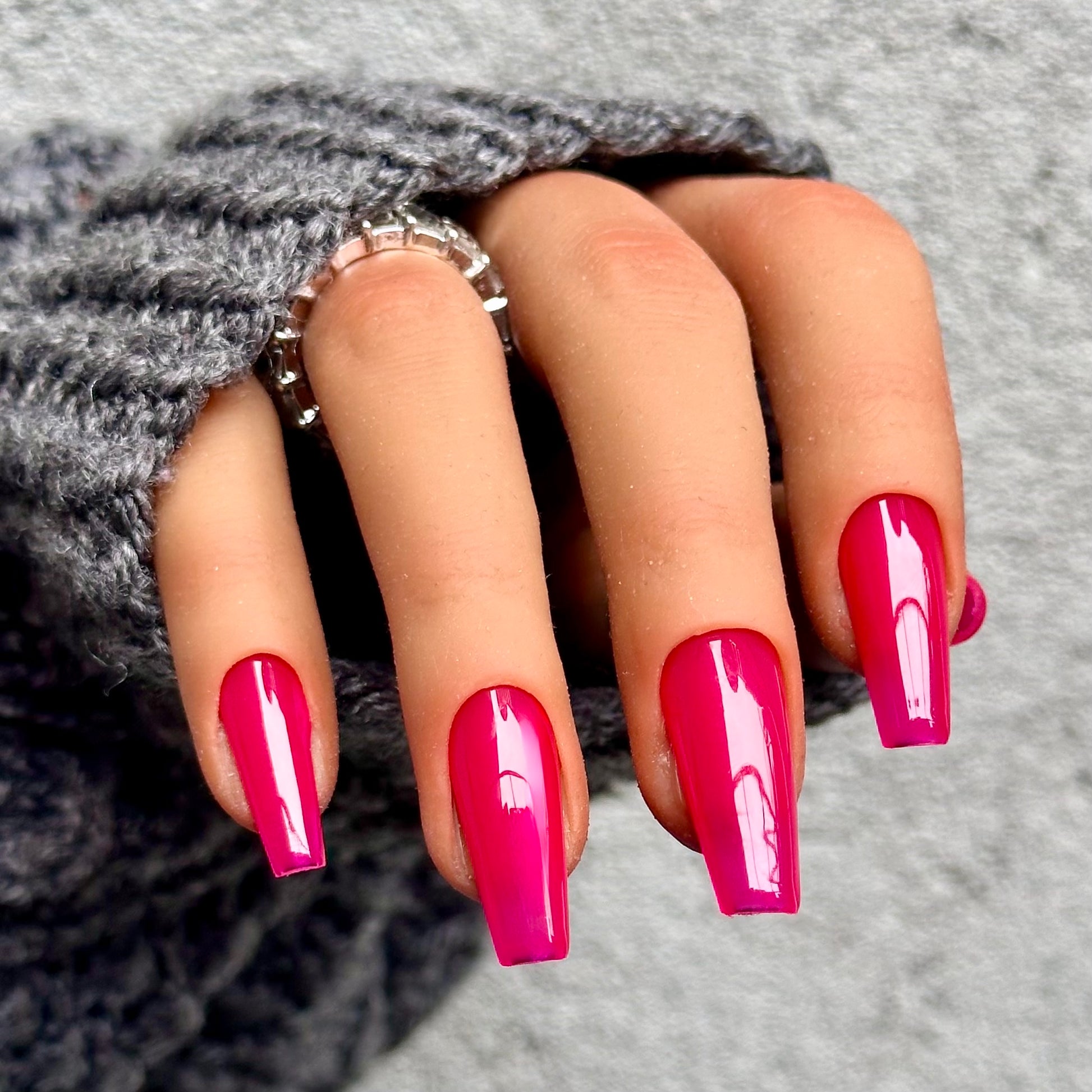 - Påfør Soak-Off Polish i den ønskede farve, i et tyndt ensformigt lag og hærd i 60 sek. (90 sek. ved mørke eller meget pigmenterede farver) i hybridlampe – Dækker farven ikke som ønsket, gentages dette trin.