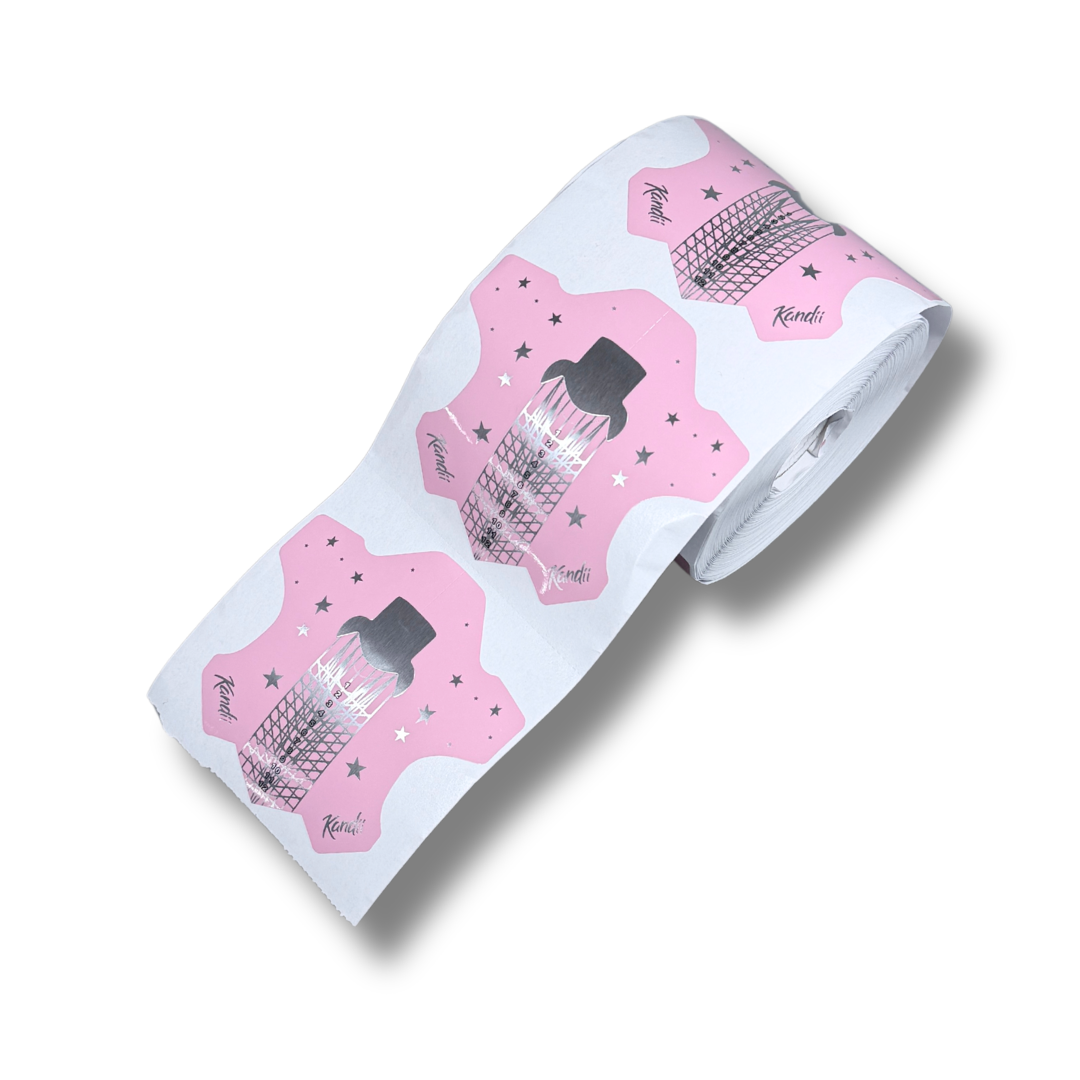 Skabelonerne er fleksible, men stabile, så de kan tilpasses forskellige negleformer uden at miste formen. De leveres på en praktisk rulle, så du nemt kan tage én ad gangen under arbejdet - Og så er de mega cute babypink med sølvstjerner på!